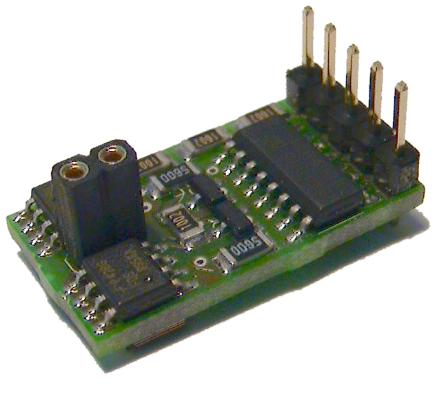 Modellbau Module: AusgangstreiberDer Ausgangstreiber ermöglicht den einfachen Anschluß von größeren Lasten an das Hauptmodul. Jeder Ausgangstreiber entspricht einer H-Brücke, daß heißt, man kann direkt einen Motor mit bis zu 1 Ampere anschließen, und diesen über das Hauptmodul steuern (Vorwärts/Rückwärts). Eine Geschwindigkeitsregelung ist per PWM auf Seiten des Hauptmoduls möglich. Technische Daten: